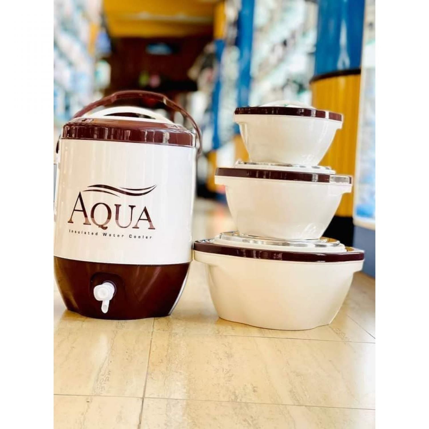 Enhance your beverage storage and serving with the Aqua 4-Piece Thermos and Water Cooler Set, exclusively available at Shahbaz Carpet Mall. Designed for both style and functionality, this set is perfect for keeping your drinks at the ideal temperature and ensuring hydration on the go.